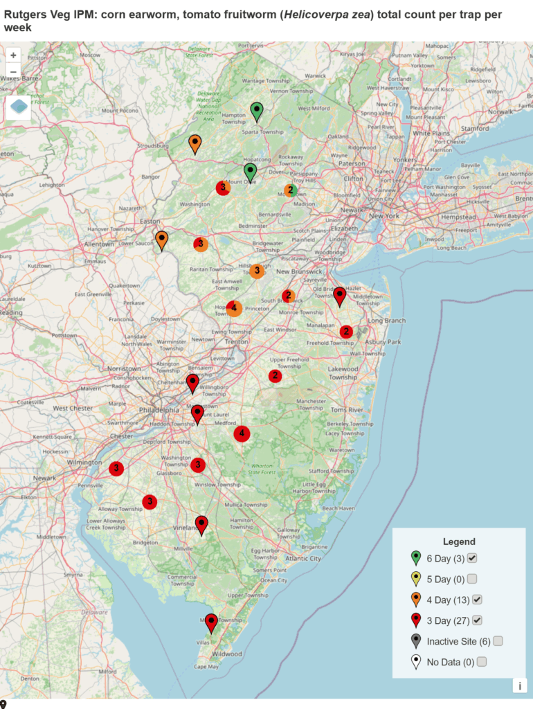 Spray intervals based on nightly pheromone moth captures for the southern part of New Jersey. Note that not all locations in the IPM program are currently trapping. This map is based on the following thresholds: 0 moths = 6-7 day schedule, 1 moth = 5 day spray schedule, 2-20 moths = 4 day spray schedule, 20+ moths = 3 day spray schedule.